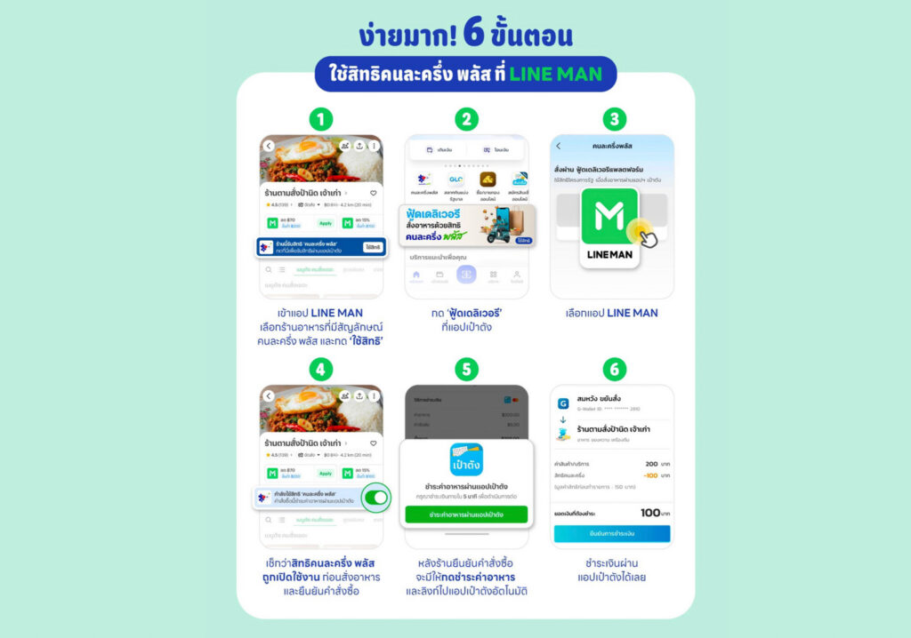 เพียงเปิดแอป LINE MAN แล้วสั่งอาหารจากร้านที่เข้าร่วมโครงการ “คนละครึ่ง พลัส” ก็สามารถสั่งได้ง่ายที่สุดในไม่กี่ขั้นตอน เพียงกดใช้สิทธิจาก ร้านที่มีสัญลักษณ์ “คนละครึ่ง พลัส” บนแอป LINE MAN จากนั้นไปที่แอป เป๋าตัง แล้วกดเมนู สั่งอาหารฟู้ดเดลิเวอรี เลือกแอป LINE MAN เมื่อเลือกเมนูและยืนยันคำสั่งซื้อ ระบบจะส่งลิงก์ชำระเงินไปยังแชท กดลิงก์นั้นเพื่อดำเนินการชำระเงินผ่านแอปเป๋าตัง ก็อิ่มอร่อยกับเมนูโปรดได้ทันที พร้อมสัมผัสความสะดวกและความคุ้มค่าแบบจัดเต็มด้วยส่วนลดต่อเนื่องถึง 2 ต่อ