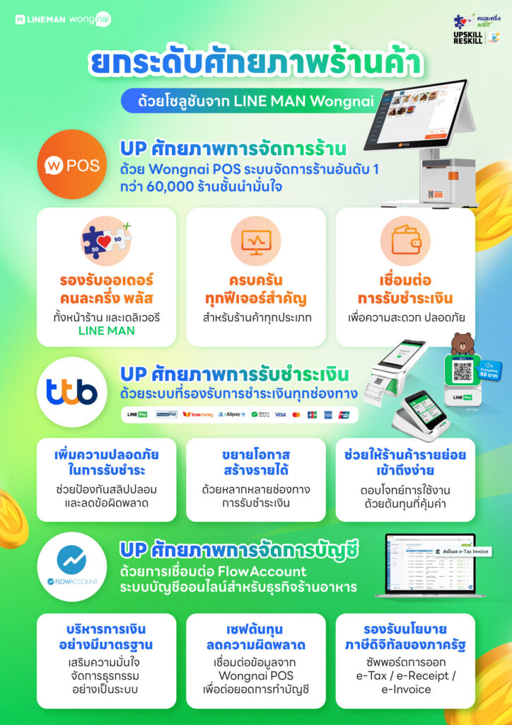 เพื่อร่วมผลักดัน​​โครงการพัฒนาความรู้ทักษะ (Upskill) หรือเรียนรู้ทักษะใหม่ (Reskill) สำหรับร้านค้าที่เข้าร่วมโครงการคนละครึ่งพลัส ให้เกิดผลเป็นรูปธรรม LINE MAN Wongnai จับมือกับ ttb และ FlowAccount นำเสนอ “ผู้ช่วยทางการเงินอัจฉริยะ” ที่รวมเทคโนโลยีระบบ Wongnai POS การจัดการยอดขายหน้าร้านและออนไลน์ ระบบรับชำระเงินครบวงจร บริการสินเชื่อธุรกิจอนุมัติรวดเร็ว ระบบบัญชีดิจิทัล และเครื่องมือ AI วิเคราะห์ข้อมูลร้านค้า ช่วยให้ผู้ประกอบการบริหารธุรกิจได้แม่นยำขึ้น ลดต้นทุน เพิ่มรายได้ และเข้าถึงโอกาสใหม่ในเศรษฐกิจดิจิทัล โดยร้านค้าสามารถขอรับ D-Voucher จากสำนักงานส่งเสริมเศรษฐกิจดิจิทัล (depa) มูลค่า 5,000 บาท สำหรับทดลองใช้บริการซอฟต์แวร์ Wongnai POS ได้ฟรี 6 เดือน อ่านรายละเอียดเพิ่มเติมได้ที่ https://aitransform.depa.or.th/